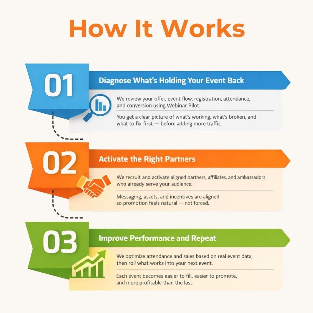 If your registrations are inconsistent, attendance is low, or sales don’t match your list size — we fix the promotion and the conversion.